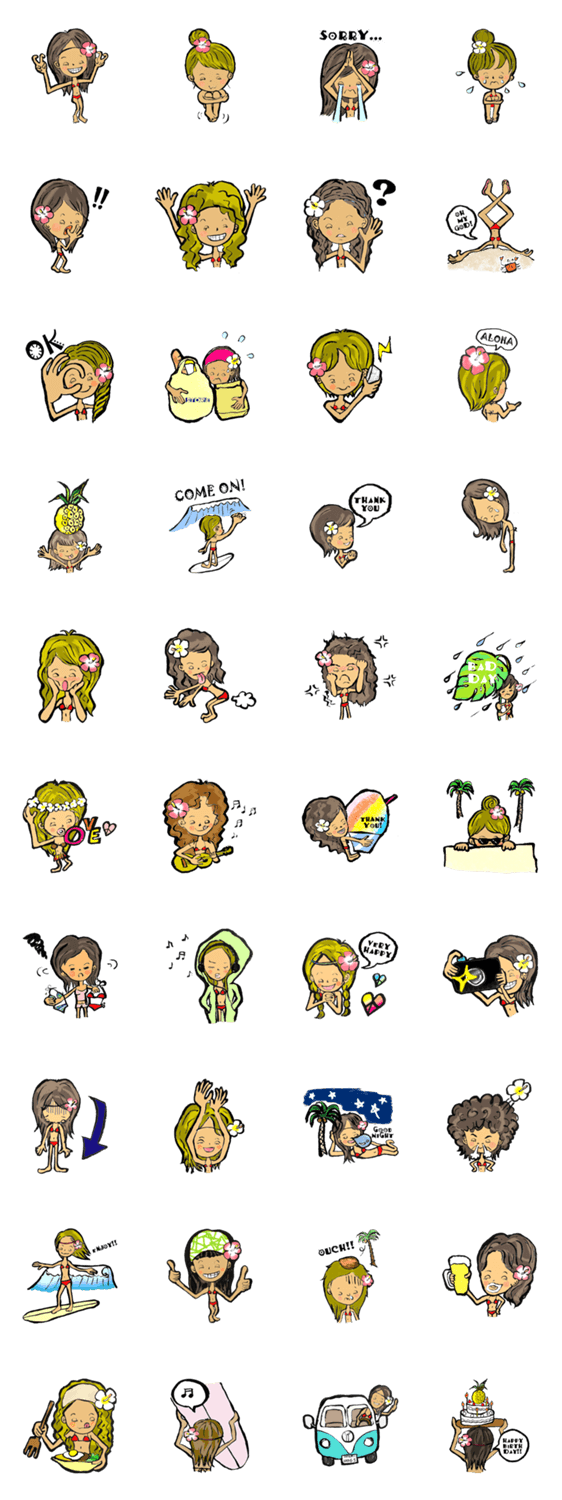 | スタンプ説明 | ハワイのロコガールのまったりとした日常を描きました。 気分だけならいつでも自由にハワイにぶっ飛べますよ。 ロコたんに逢いたかったら是非とも。 |