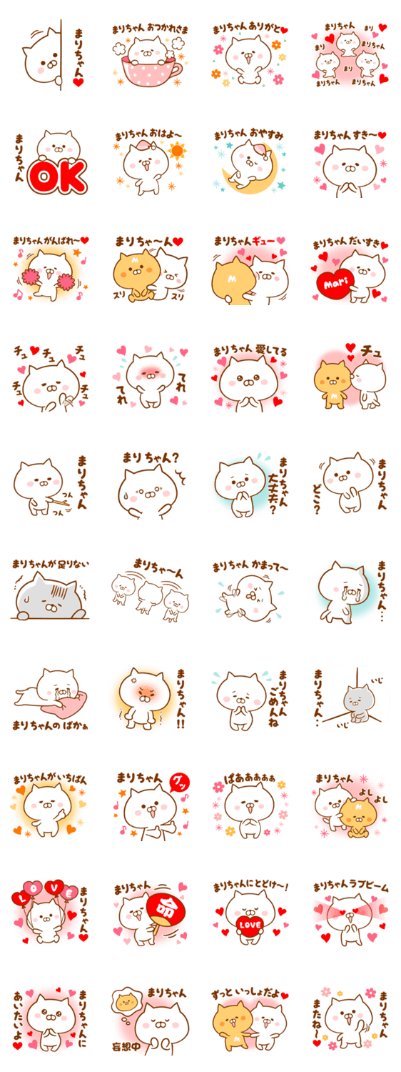 まり/まりこ/まりな/まりえ/まりか/まりあ/まりん等、まりちゃんに送る名前・あだ名スタンプです。かわいいネコで恋人、夫婦、友達に気持ちを伝えてね♥