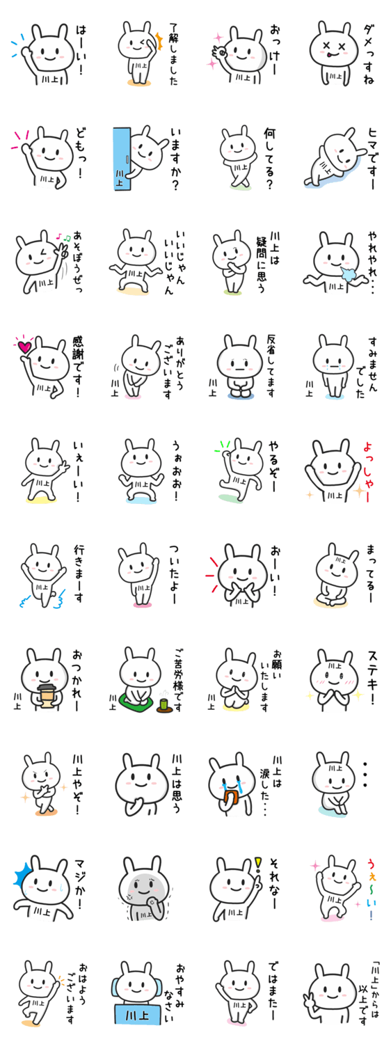 名字(苗字)が川上(かわかみ)の人が使えるうさぎの名前スタンプです。日常会話で使いやすい基本セットになってます。