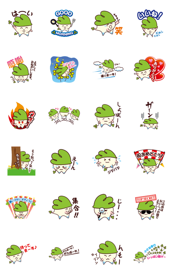 | スタンプ説明 | 三つ葉の花言葉は「幸福」 三つ葉から生まれたちょっと臆病な妖精 スタンプを送った相手に小さな幸せが訪れるかも!? |
