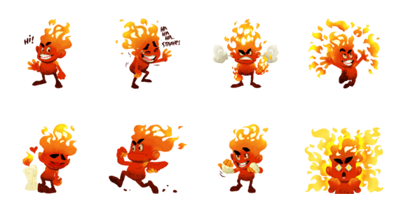 | スタンプ説明 | A set of fire spirit being who always spiritful, joy, and had a short fuse when it comes to his temper. Burn baby burn! |