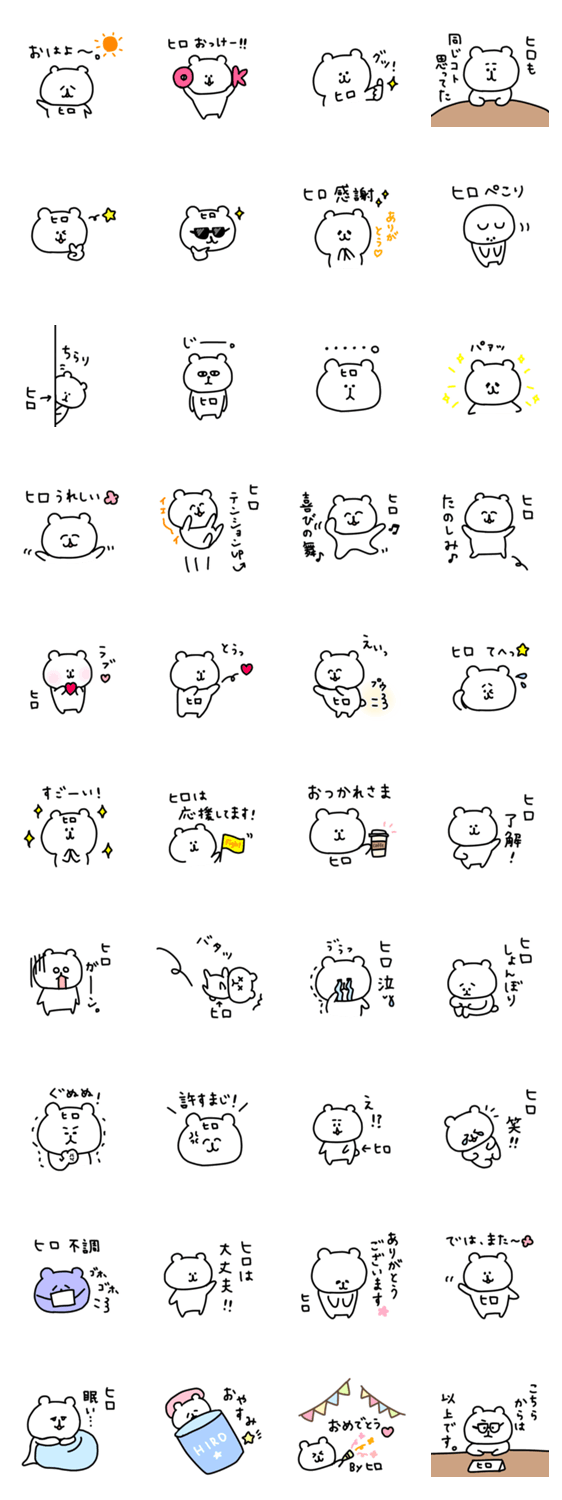 あだ名、名前がヒロさんのためのスタンプです。名前がひろき・ひろし・ひろゆき・ひろふみ・ひろと・ひろみ・ひろこ・ひろえさん。名字が広田・広瀬さんなど。