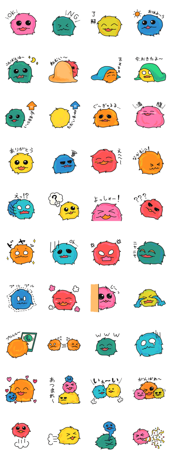 カラフルな毛玉生物、モフモーラが日々の生活を楽しむスタンプです。