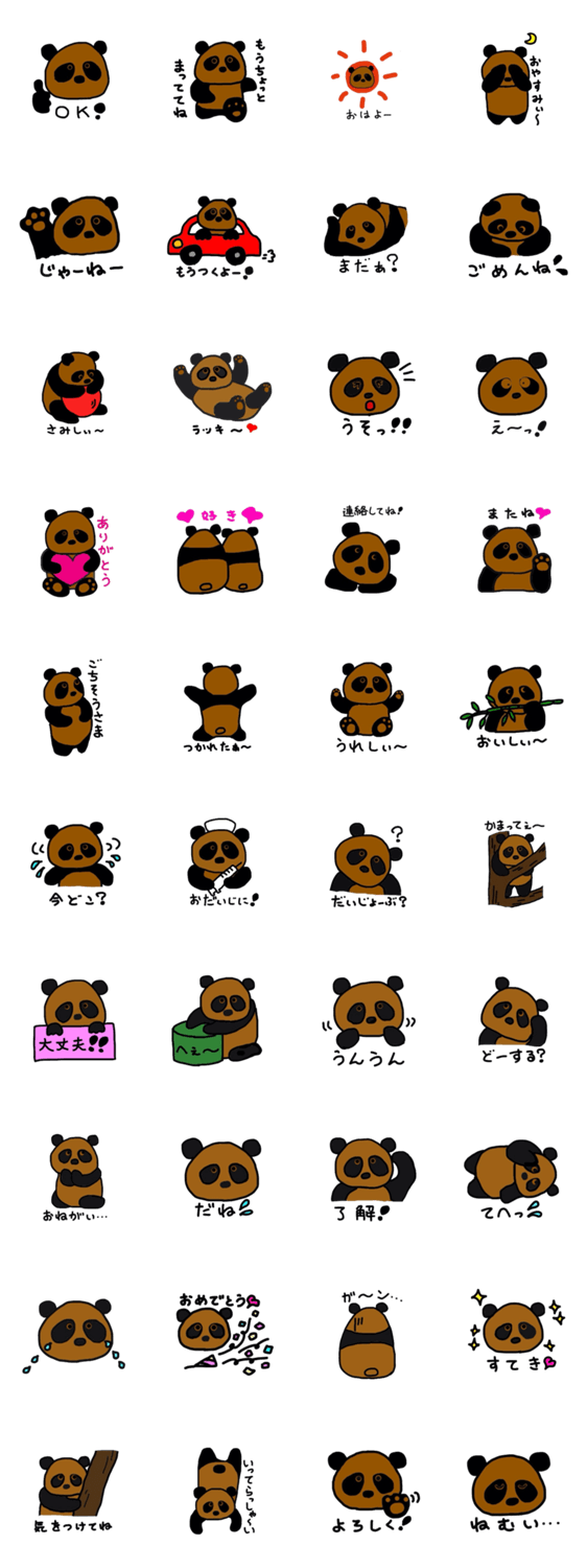 | スタンプ説明 | お外で遊ぶのが大好きなパンダちゃん!!ちょっと日焼けし過ぎ?で、こげちゃったぁ。毎日使える便利なかわいいスタンプ!!ぜひ使ってみてください!! |