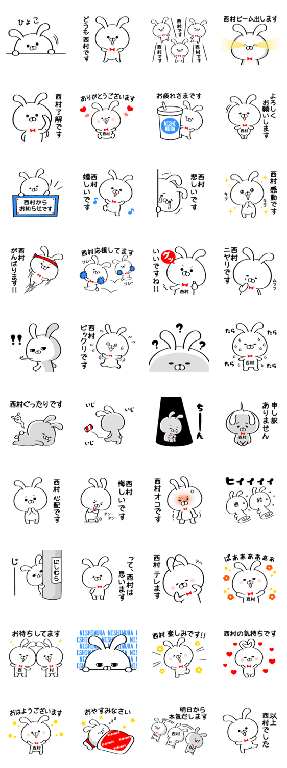 名字(苗字)西村(にしむら)さんが使うウサギの名前スタンプです。仕事仲間にも使えるように敬語・ですます調になっています。40個スタンプです。