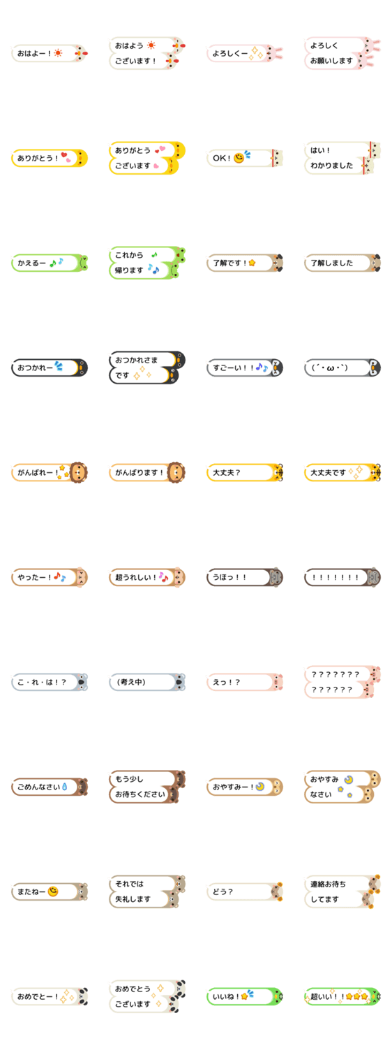 | スタンプ説明 | 動物な吹き出しのスタンプ「どうぶつなふきだし」で楽しく会話してね。 |