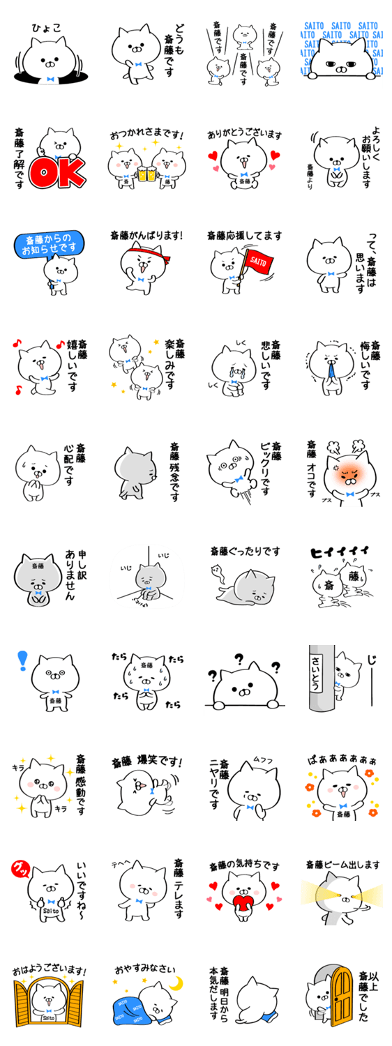 名字(苗字)斎藤/斉藤/齋藤/齊藤(さいとう)さんが使うウサギの名前スタンプです。仕事仲間にも使えるように敬語・ですます調になっています。40個スタンプです。