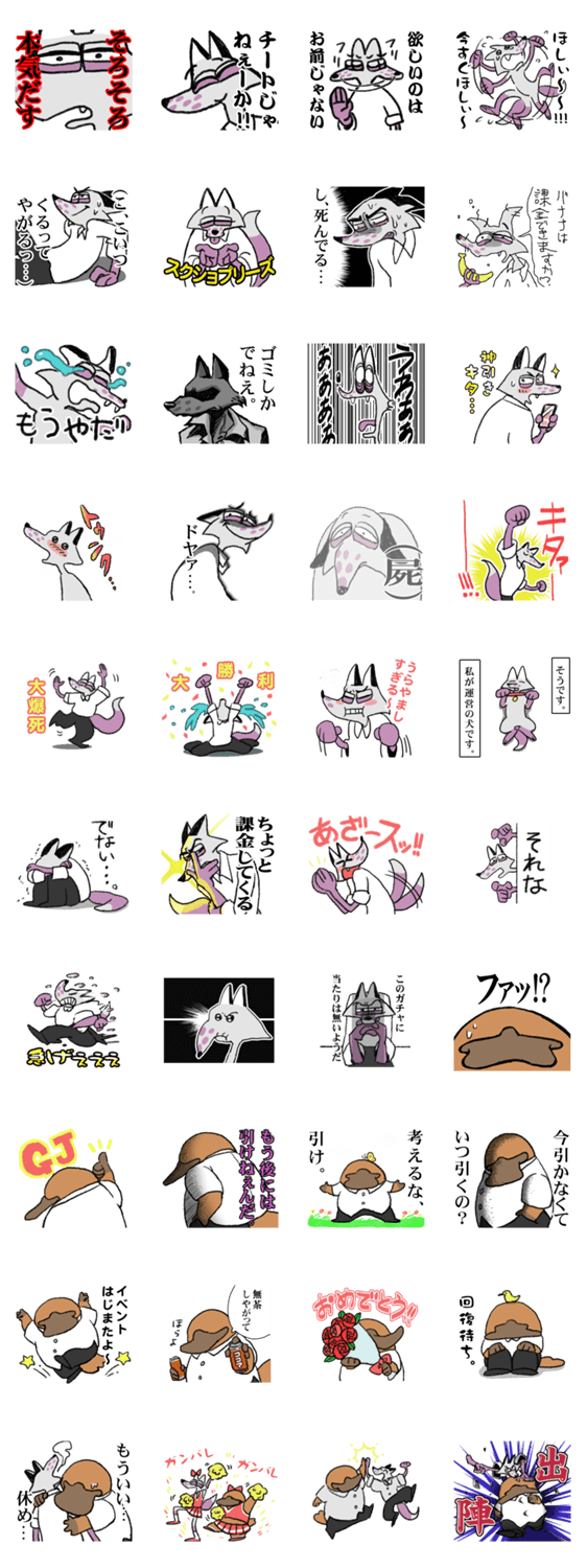 オリジナルキャラのキツネとカモノハシのオタク高校生の獣人がソシャゲを楽しい出るスタンプ。 名前はキツネ(スポット)、 カモノハシ(はしもん)