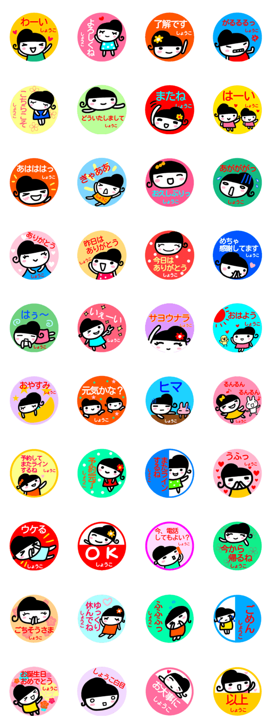 しょうこさん、ちゃん(祥子、翔子、昭子、晶子、聖子、紹子、ショウコ)が使う名前スタンプです。 挨拶基本セットです。