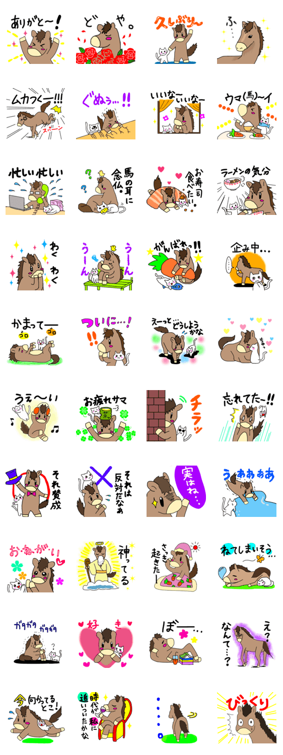 | スタンプ説明 | 仲良しな馬と猫のスタンプです。日々の感情を可愛く、時には鋭く伝えます。 |