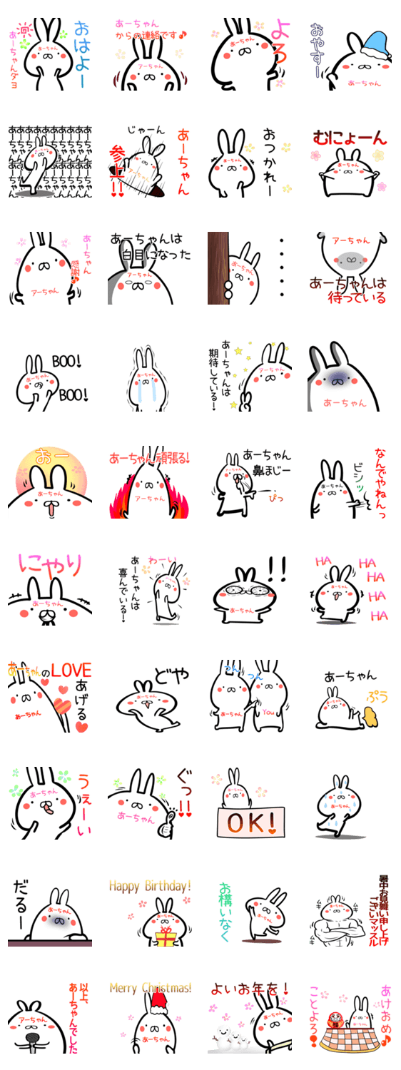 | スタンプ説明 | アーちゃん用の可愛いウサギのゆるいなまえ/あだ名スタンプ。あつお/あずみ/あつし/あいこ/あいな/あきな/あきら/あかり/あやか/あすか/あみる/あんな/あさみ等の名前専用 |