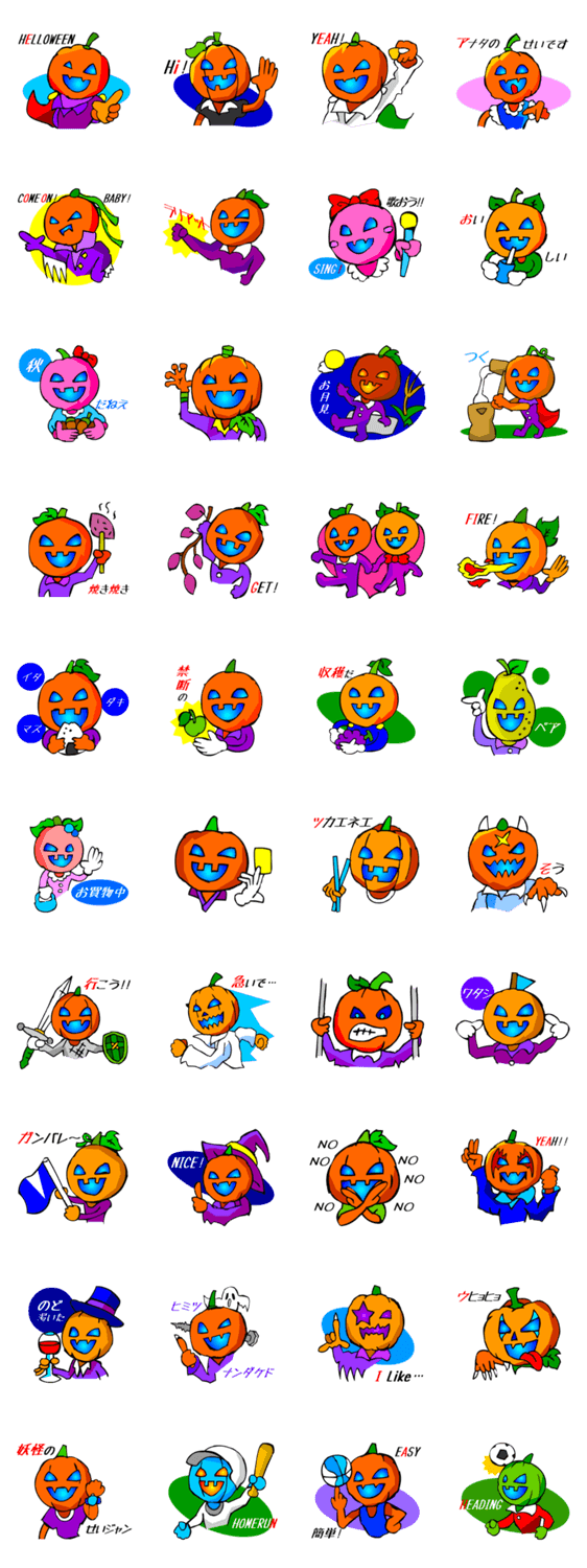 かぼちゃ顔でかわいいハロウィンキャラのスタンプ、表情豊かで感情やスポーツや秋のイベントタイトル満載。