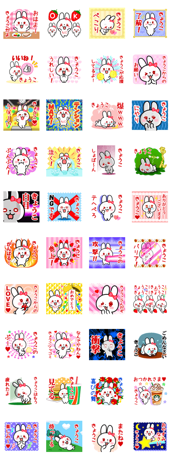 「きょうこ」ちゃん、「きょうこ」さんのための名前スタンプです。白いうさぎがかわいく気持ちを表現します。毎日よく使う言葉を集めました。よろしくお願いします♪