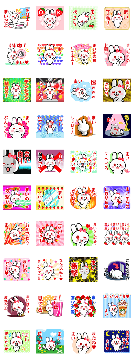 「まい」ちゃん、「まい」さんのための名前スタンプです。白いうさぎがかわいく気持ちを表現します。毎日よく使う言葉を集めました。よろしくお願いします♪