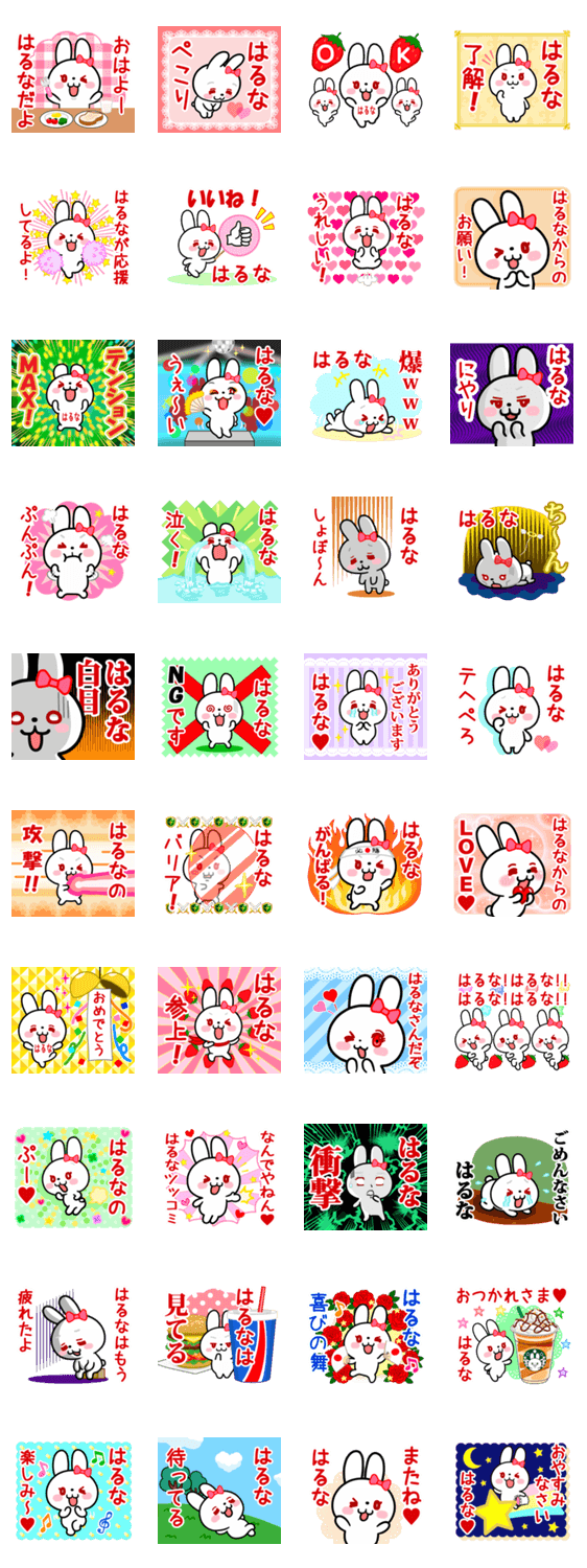 「はるな」ちゃん、「はるな」さんのための名前スタンプです。白いうさぎがかわいく気持ちを表現します。毎日よく使う言葉を集めました。よろしくお願いします♪