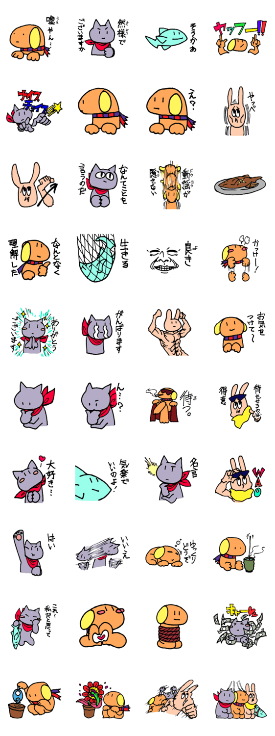 いぬ、ねこ、うさぎ、さかなの自由なスタンプです。