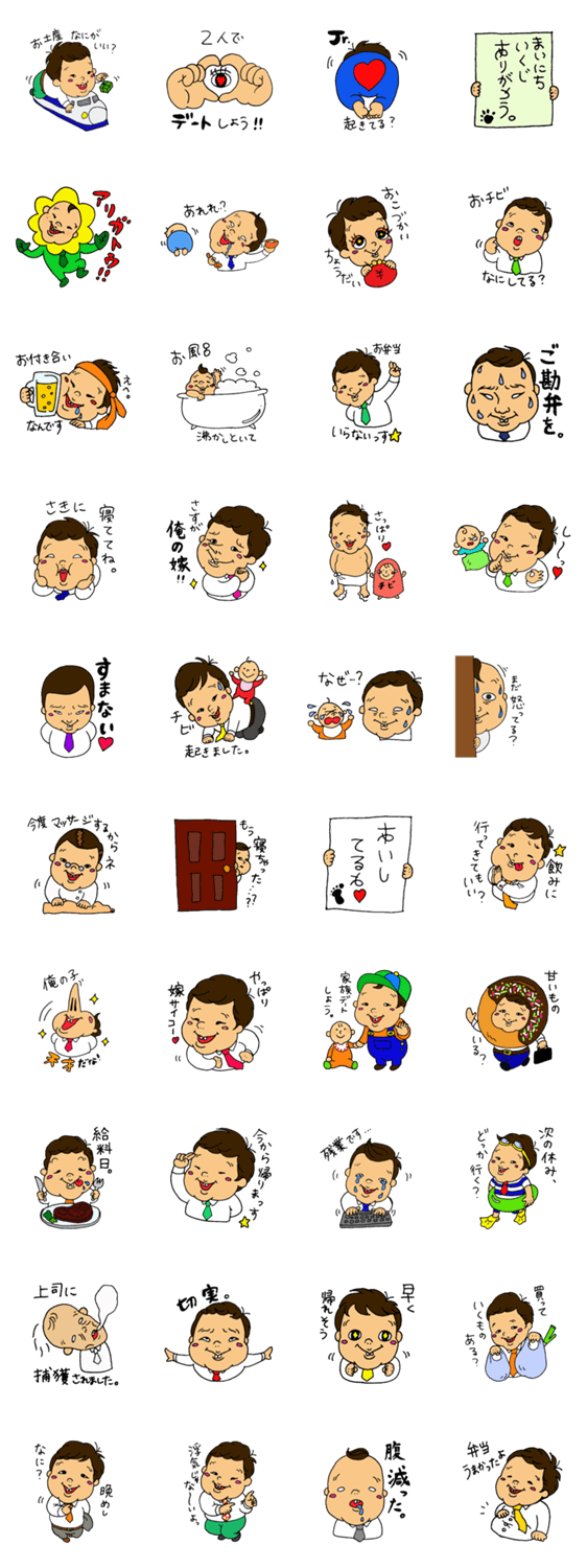 赤ちゃんの顔をしたサラリーマンパパを描いています。仕事と育児に奮闘するパパか使いやすく、受け取ったママが笑えるスタンプにしました。