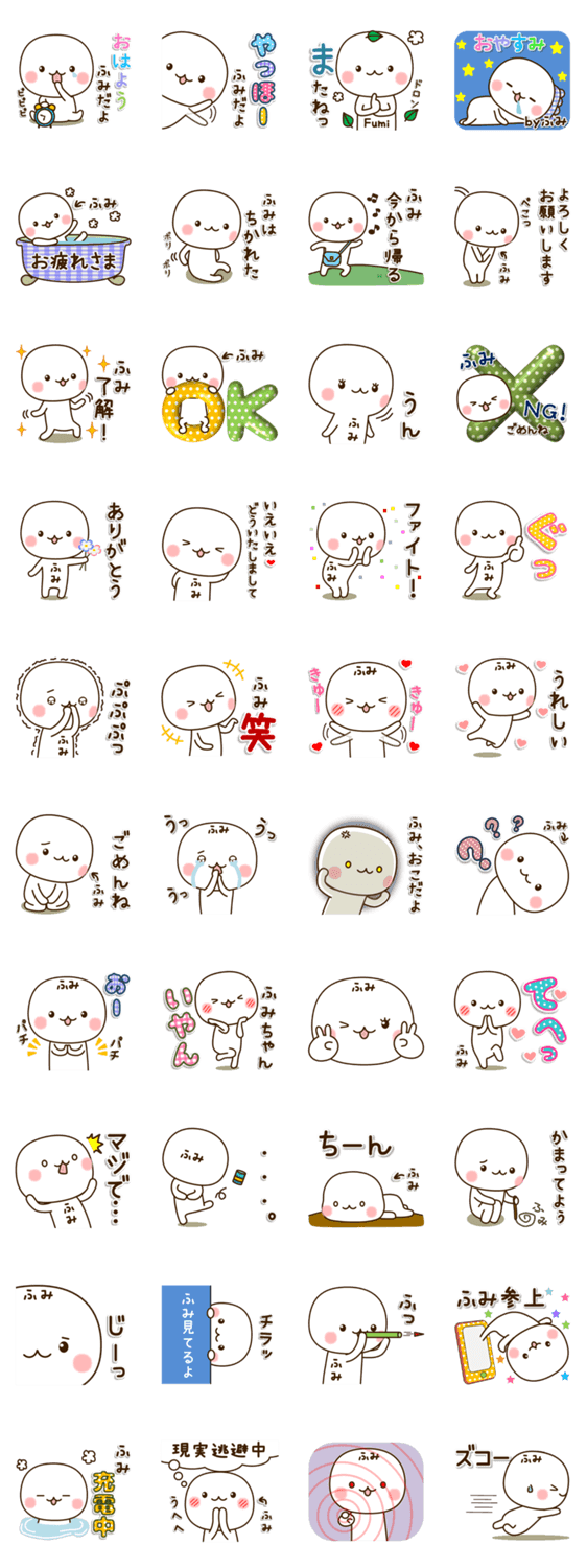 名前に【ふみ】が付く人専用のスタンプです。ふみえや、ふみこ、ふみや、ふみよなど、ふみがつく人なら誰でも使えます!プレゼントにもどうぞ