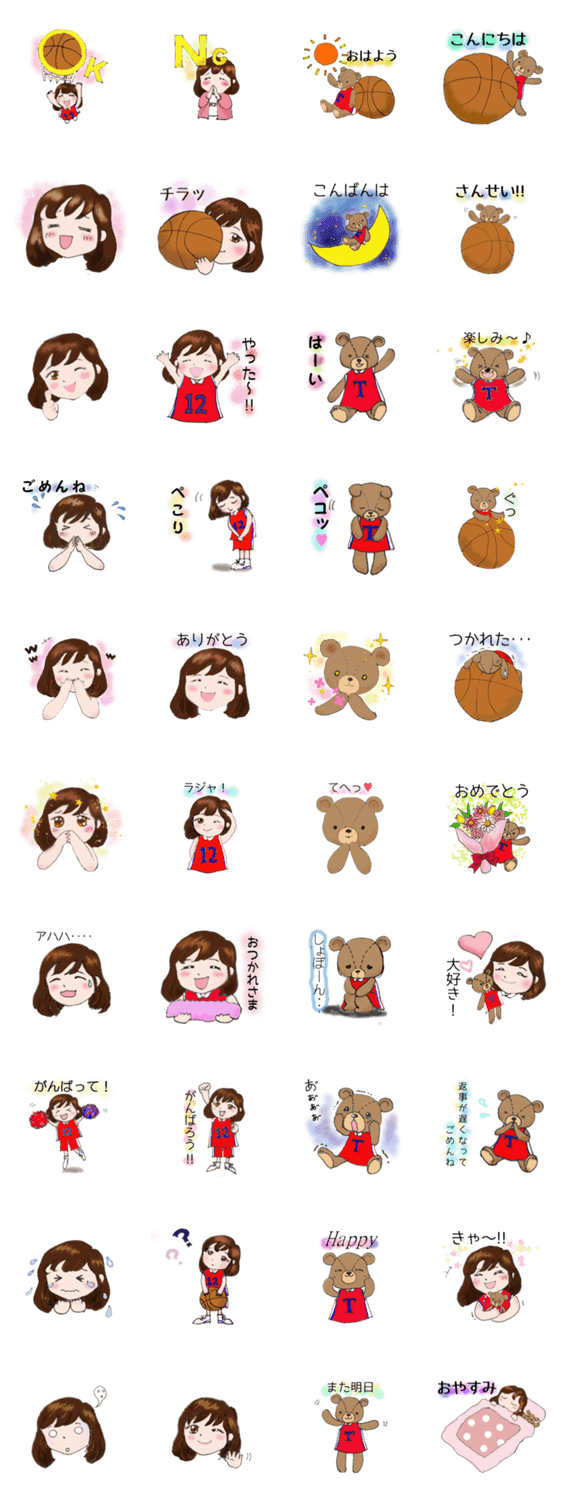 日常よく使う言葉を集めました。 バスケが大好きな女の子とお気に入りのクマのぬいぐるみのスタンプです。