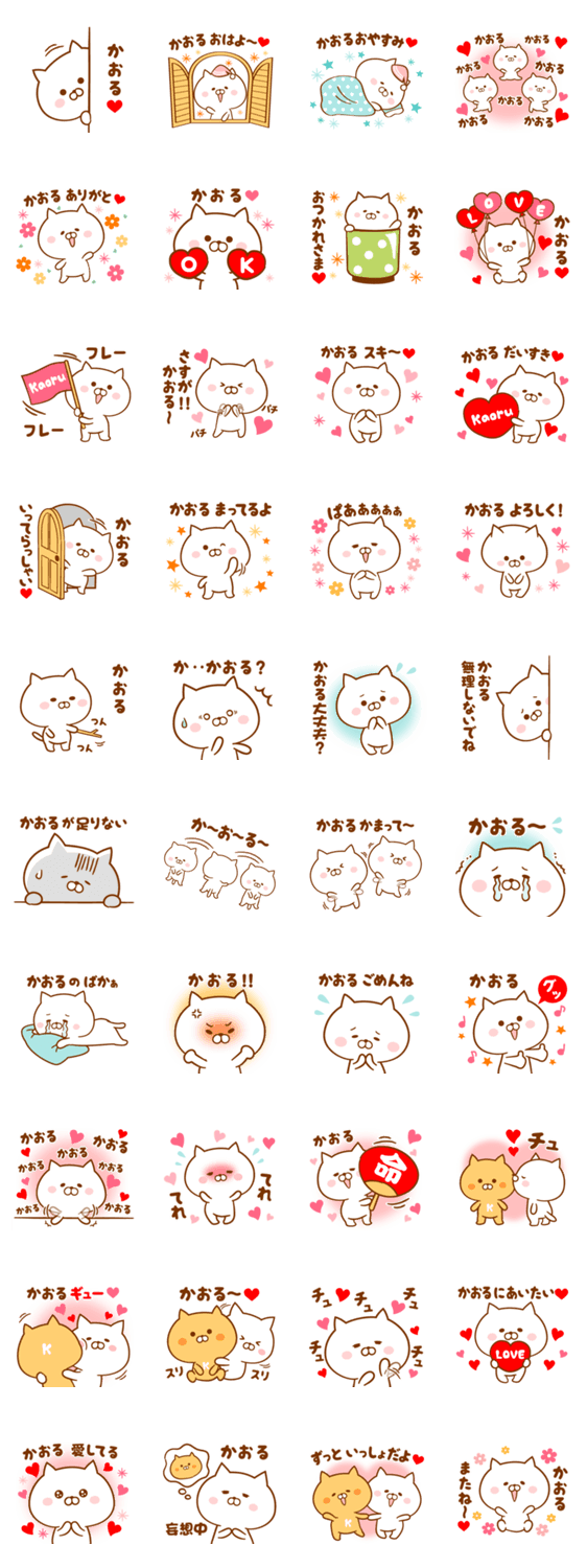 かおる/カオル/薫/馨/香/芳 等、かおるくん、かおるちゃんに送る名前・あだ名スタンプです。かわいいネコで大好きな恋人、家族、友達に気持ちを伝えてね♥
