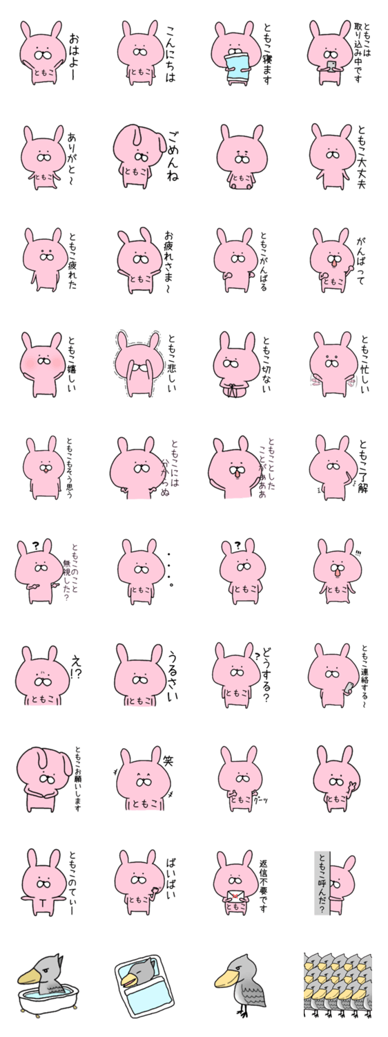 ともこさんのためだけのスタンプを作りました。名前がともこさんの方には是非是非使って頂きたいです。友だちのハシビロさんもいます。