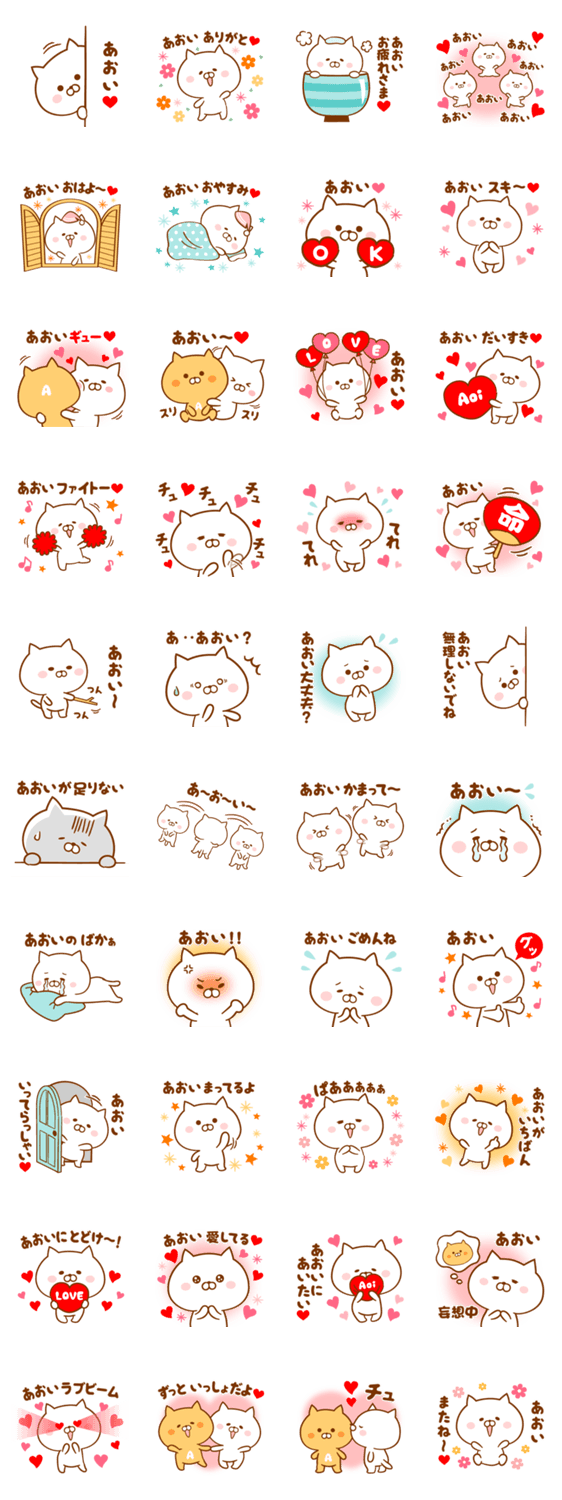 あおい/アオイ/葵/碧/藍/海生/碧生/青井/蒼井 等、あおいくん、あおいちゃんに送る名前・あだ名スタンプです。かわいいネコで大好きな恋人,家族,友達に気持ちを伝えてね♥