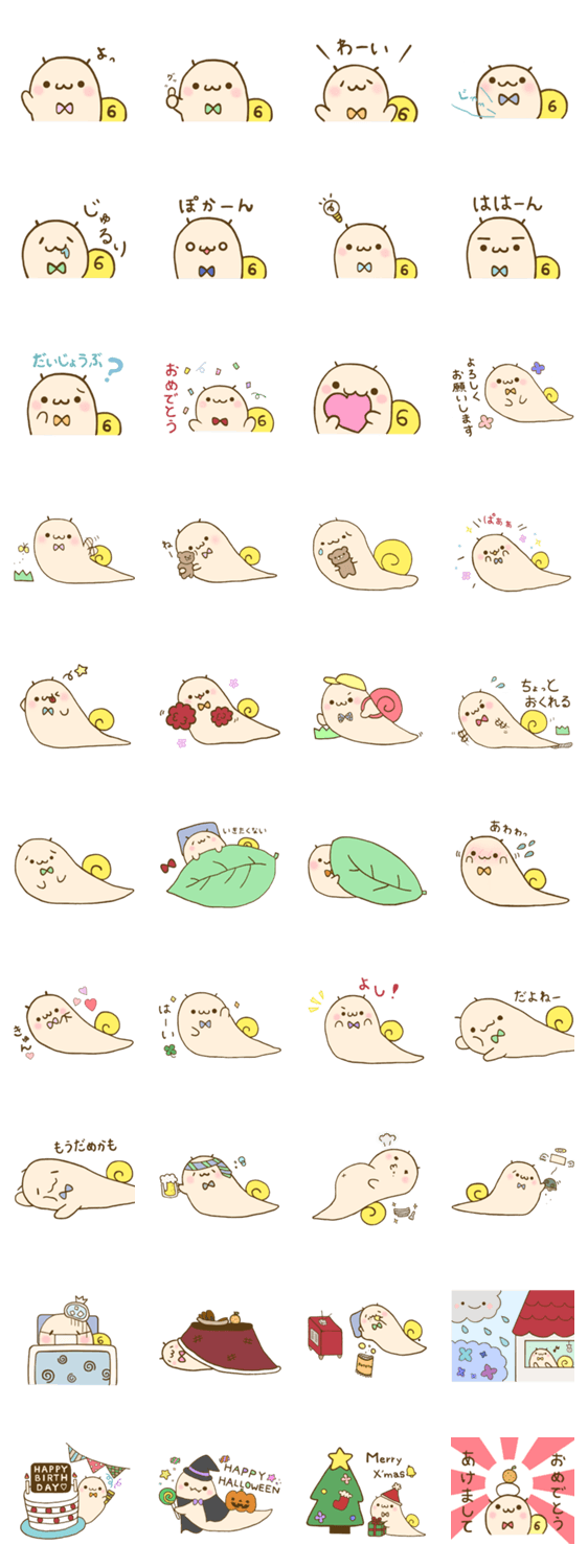ゆるーく、かわいいかたつむりの「つむりん」のスタンプです。 日常会話だけでなくイベントなど一年中使うことができるスタンプです。