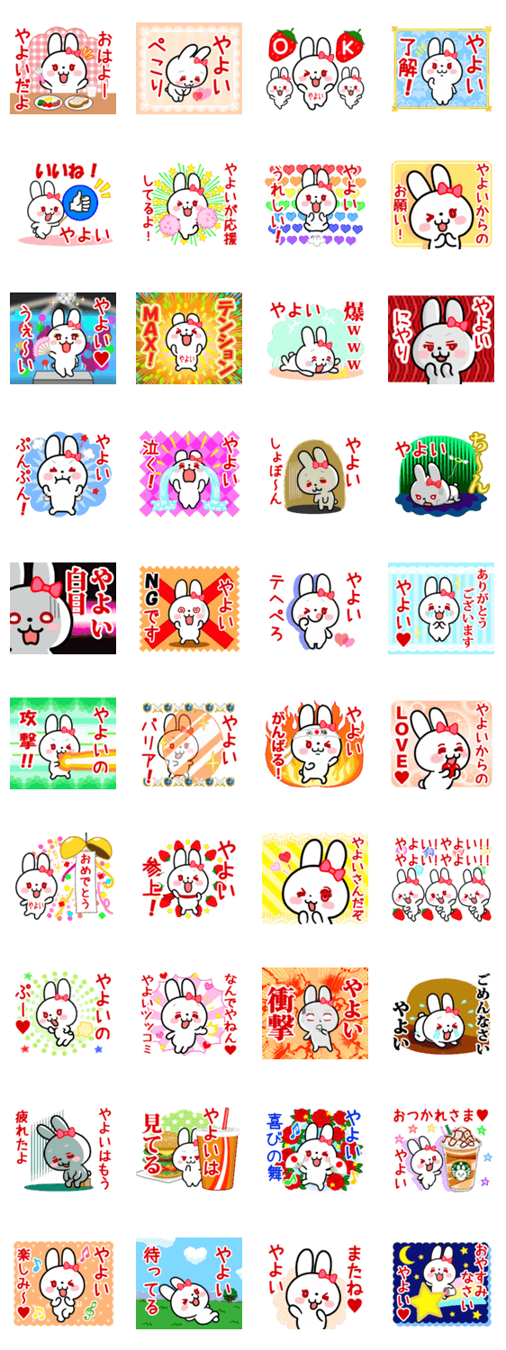 「やよい」ちゃん、「やよい」さんのための名前スタンプです。白いうさぎがかわいく気持ちを表現します。毎日よく使う言葉を集めました。よろしくお願いします♪