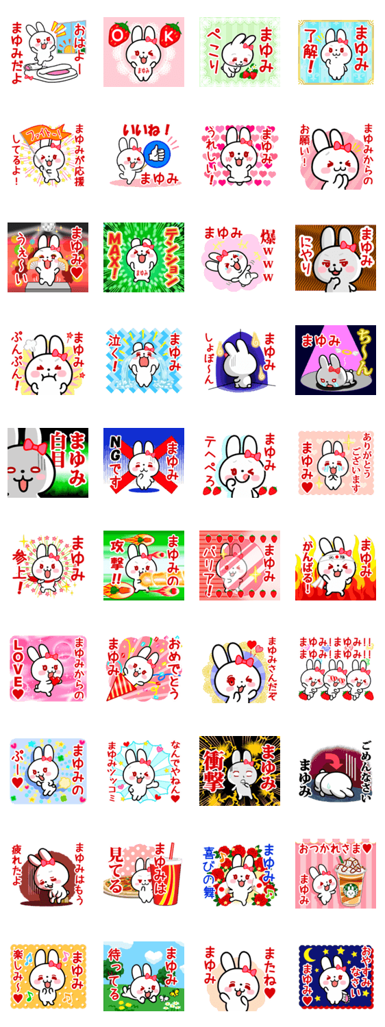 「まゆみ」ちゃん、「まゆみ」さんのための名前スタンプです。白いうさぎがかわいく気持ちを表現します。毎日よく使う言葉を集めました。よろしくお願いします♪