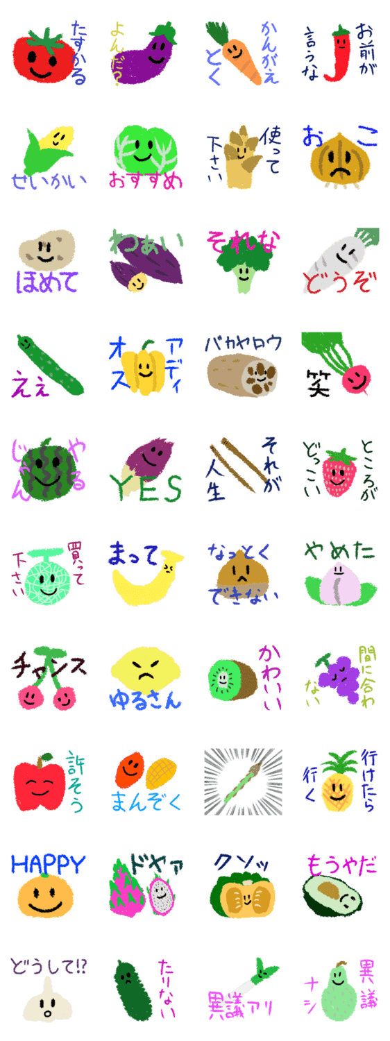 クレヨン風の野菜と果物の、ゆるくてシュールなスタンプです。