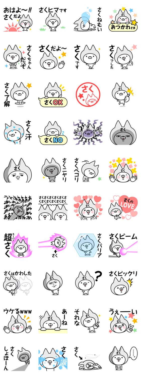 さくさんが使える名前スタンプです。サク/朔/朔久/咲久/佐久/佐来/ゆうさく/こうさく/だいさく/けんさく/えいさく/しんさく/しゅうさく/りゅうさくさんは是非どうぞ。