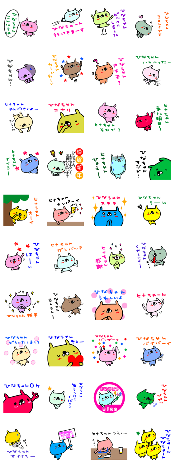 「ひなちゃん」「ヒナちゃん」の名前入りスタンプです。名前がひなこ、ひなた、苗字がひなだ、などの方へ送ってください。ひなちゃんが使ってもOK。