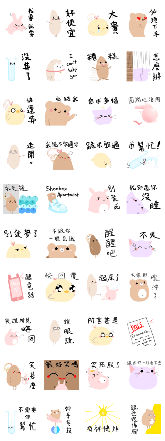 We are here to make your daily conversations fun. Join rabbit, bird, teddy bear, cat, doge, rice, cocoa bean & test tube!
