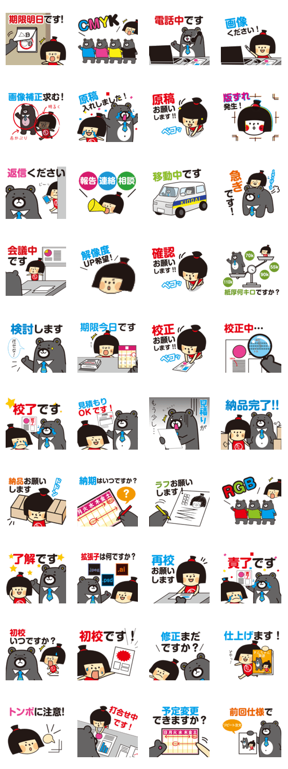 印刷業界の方、必見!好奇心旺盛な近太郎とおっとりとした性格の熊ダイゴロウが紹介する印刷・広告業界に特化したLINEスタンプ♪