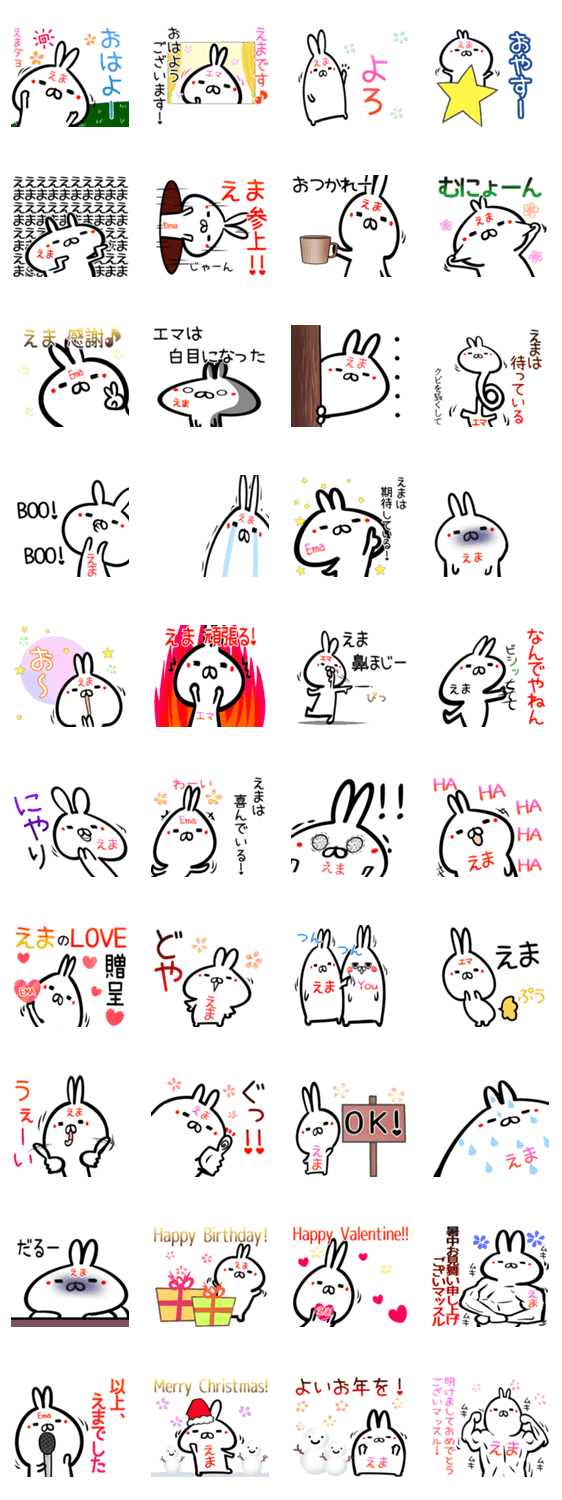 | スタンプ説明 | えまちゃん/エマさん用の可愛いウサギのゆるい名前(なまえ)あだ名スタンプ。恵麻/英麻/絵麻/栄麻/絵馬/江馬/英真/栄真/瑛茉/依舞/えまか/えまき/えまり/えまな等の名前専用 |