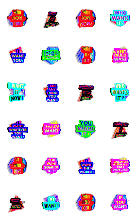 | スタンプ説明 | A collection of animated sayings of "WANT" |