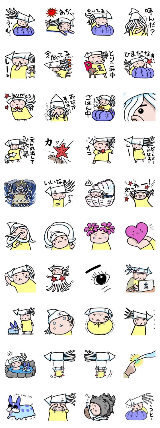イカを頭の上にのせたシュールなマスコット「あイカちゃん」のLINEスタンプ!キモこわカワイイの複雑キャラです。