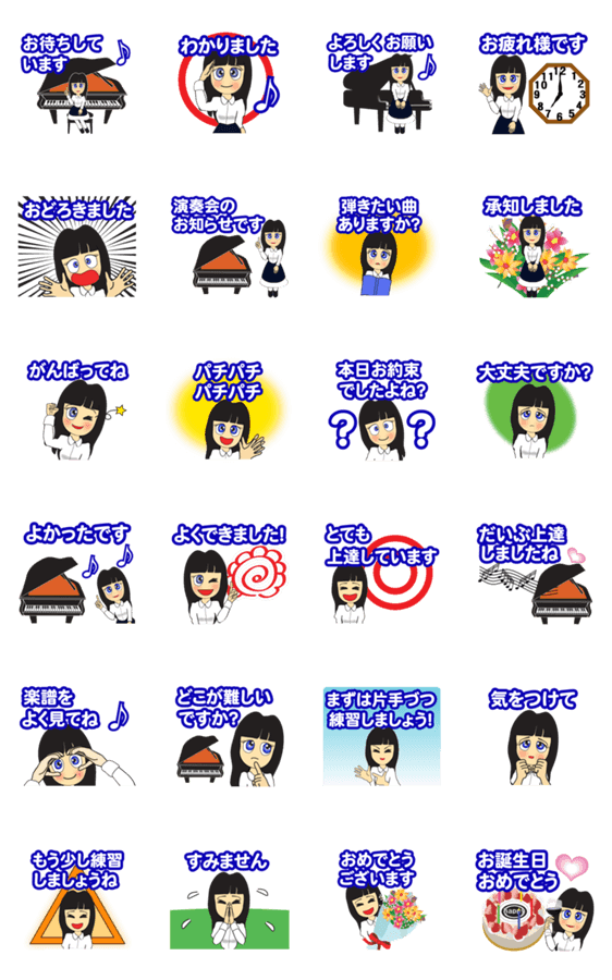 | スタンプ説明 | ピアノ教室の先生や楽器の講師・教師が生徒に送るのに便利なスタンプです。レッスンのアドバイスをしたり、ほめたり、確認したり、発表会のお知らせをしたりできます。 |