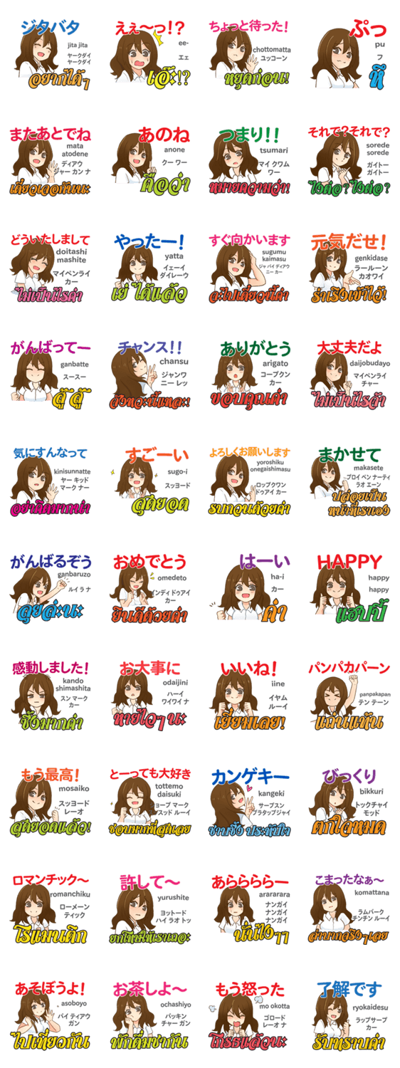 | スタンプ説明 | タイ語と日本語でタイ人と日本人が会話でよく使う言葉を選びました。ワンプッシュで円滑なコミュニケーション。タイ人と日本人が仲良くなるスタンプです。 |