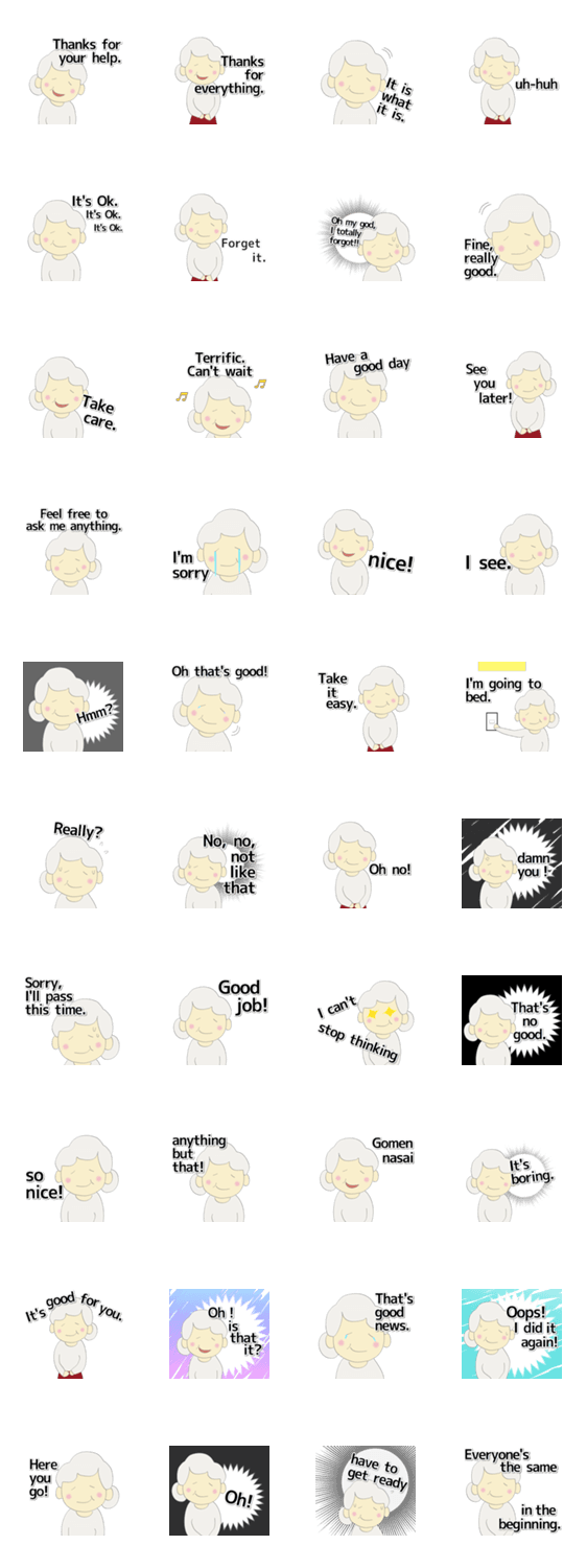 うちのおばあちゃんの英語版です。普段は存在感が薄く、あまり喋らないうちのおばあちゃんですが、発言がかわいいのでスタンプにしました。