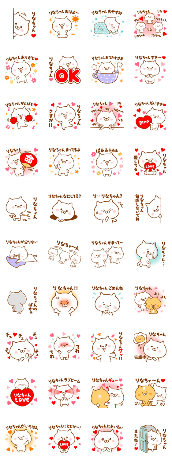 りな/りなこ/里奈/里菜/莉奈/理名/理奈子/リナ 等、りなちゃんに送る名前・あだ名スタンプです。かわいいネコで大好きな恋人、家族、友達に気持ちを伝えてね♥