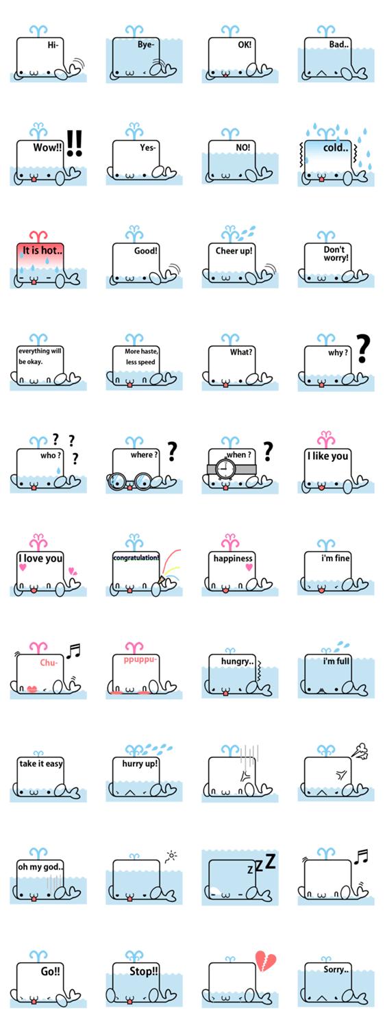 | スタンプ説明 | 心優しいアルビノクジラ 考えた内容が額に見える |