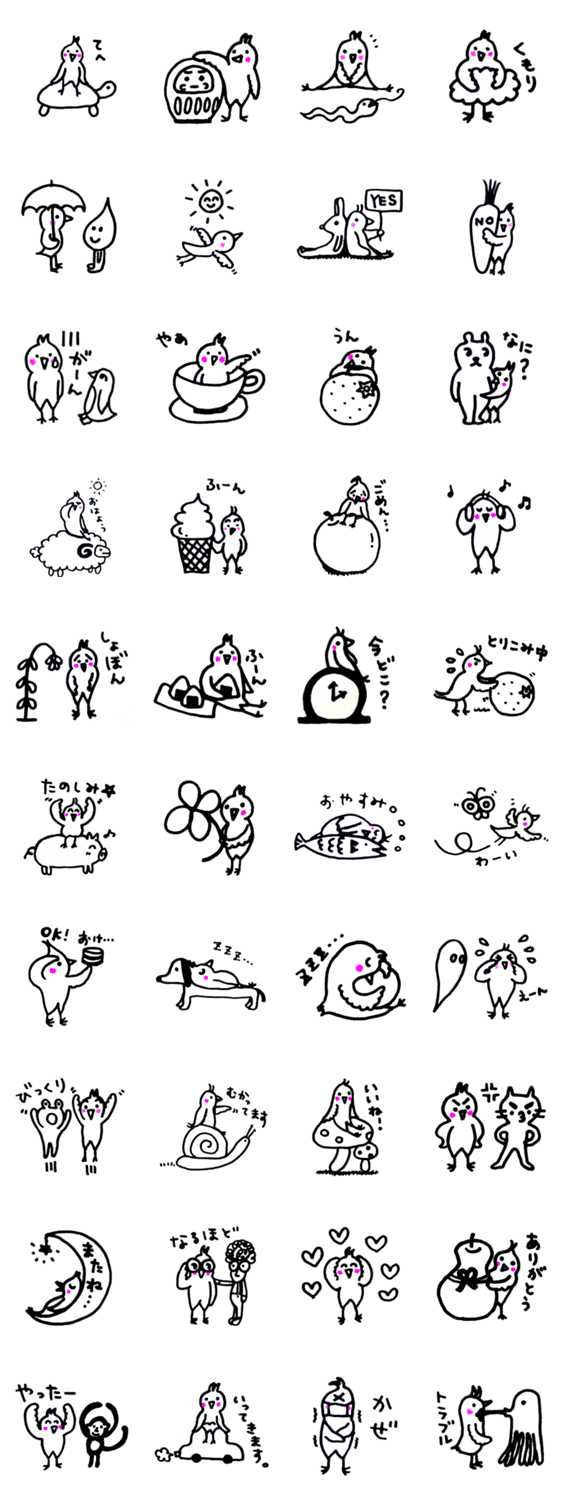 手描きのおかめインコのスタンプ。素朴でほっこり癒し系。