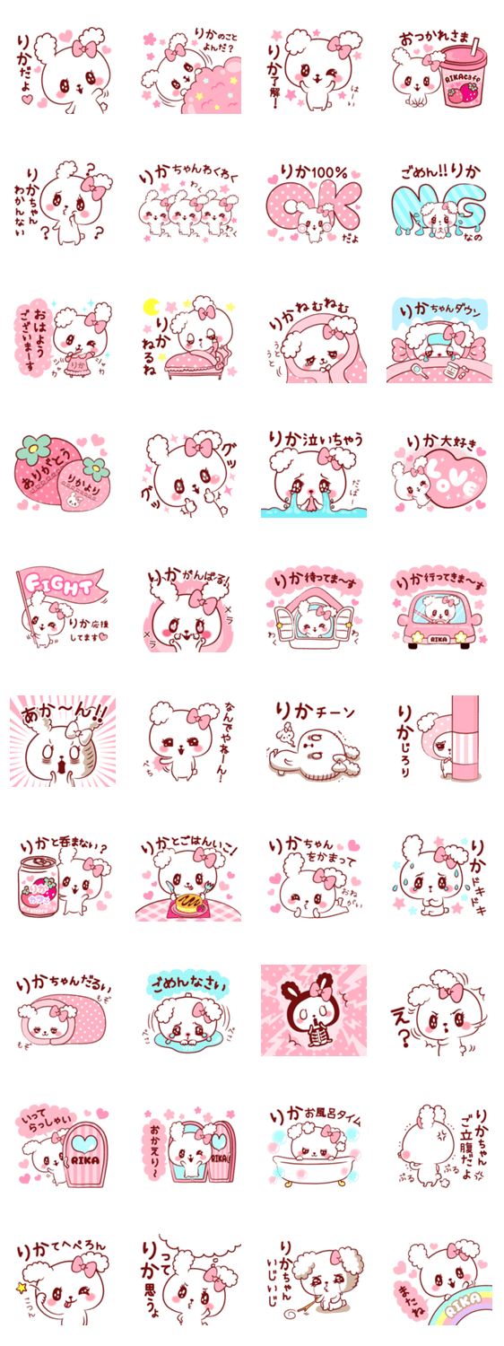 りかちゃんが使う名前スタンプ。りか、りかこ、リカのなまえの方どうぞ。愛嬌あるりかちゃんスタンプでみんなにりかちゃんのかわいらしさを伝えよう。