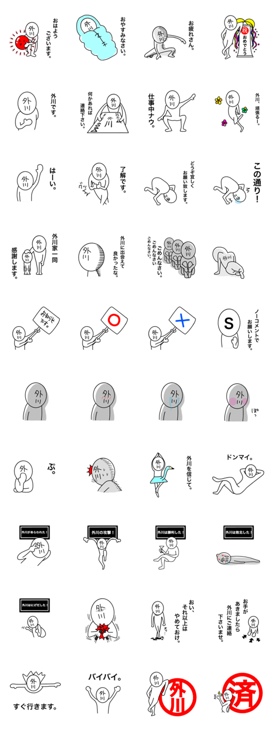 全国の外川様に使っていただける、笑いあり、涙ありのスタンプとなっております☆全国の外川様に使っていただけるのを心待ちにしております☆