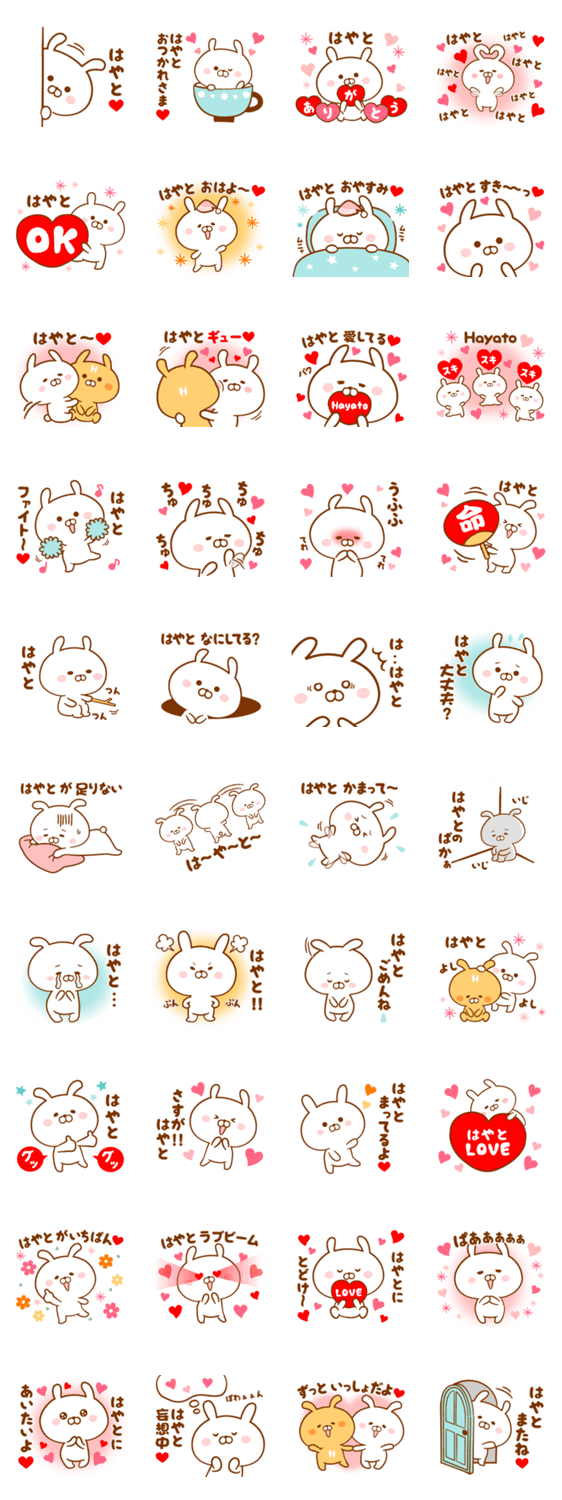 はやと/駿/隼人/勇人/勇仁/速人/迅人/颯斗/ハヤト 等、はやとくんに送る名前・あだ名スタンプです。かわいいうさぎで大好きな恋人、家族、友達に気持ちを伝えてね♥