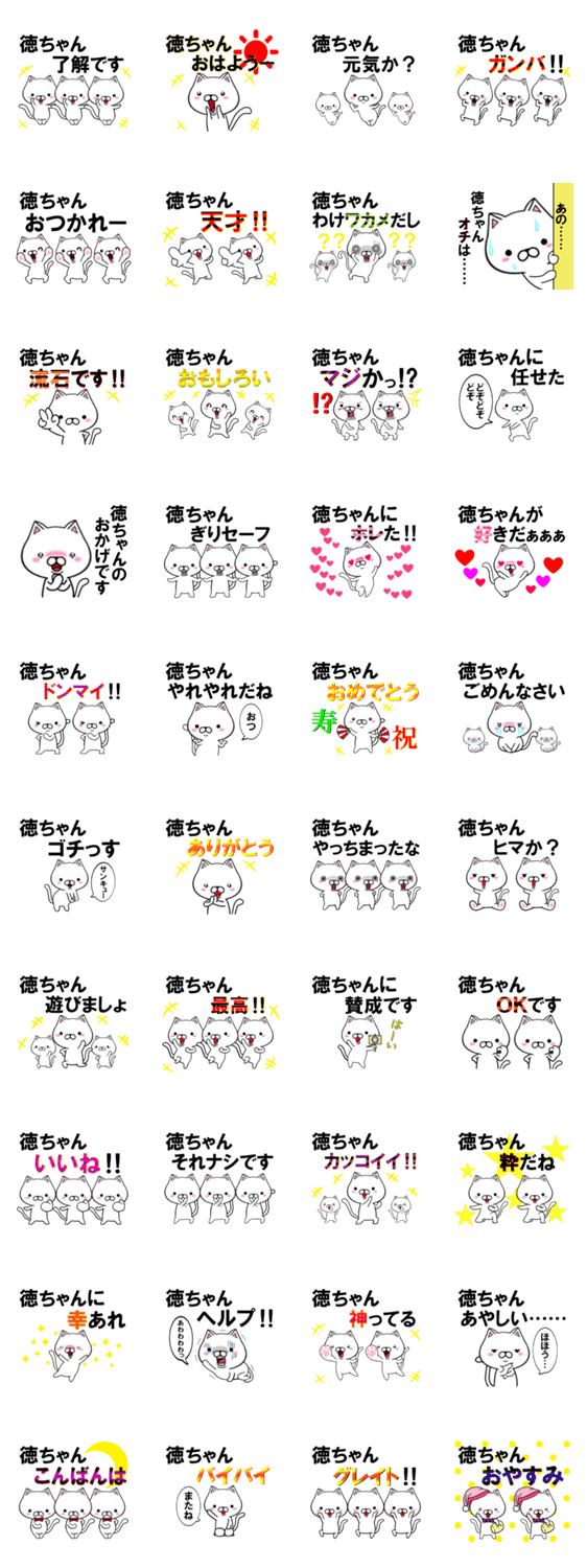名前が徳田・徳川・徳山・徳井・徳永・徳村・徳本・徳元・徳水・徳光・徳野・徳下・徳原・徳橋など、あだ名が徳ちゃん(とくちゃん、トクちゃん)に使えるスタンプです。