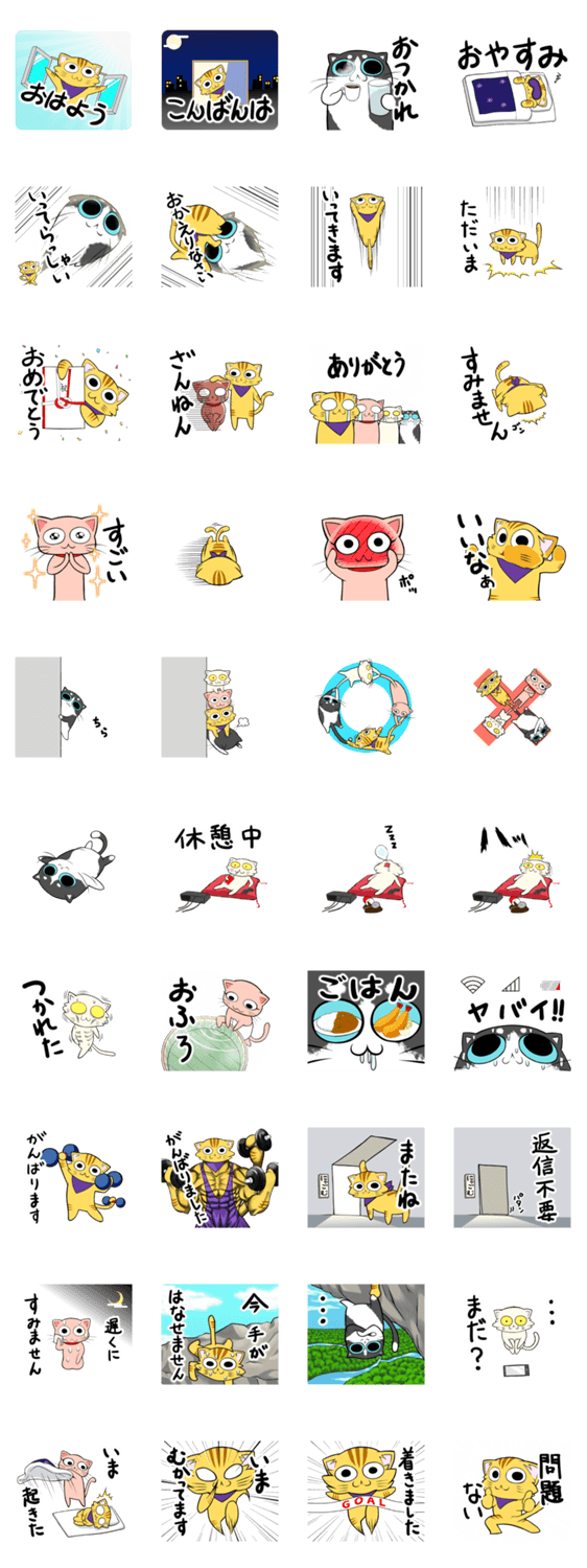トラ猫にゃごむ、ピンクのにゃーこ、クリーム色のにゃごしろ、白黒のにゃごマロの可愛く、シュールな四人組猫スタンプです。よくつかう言葉を用意しました。