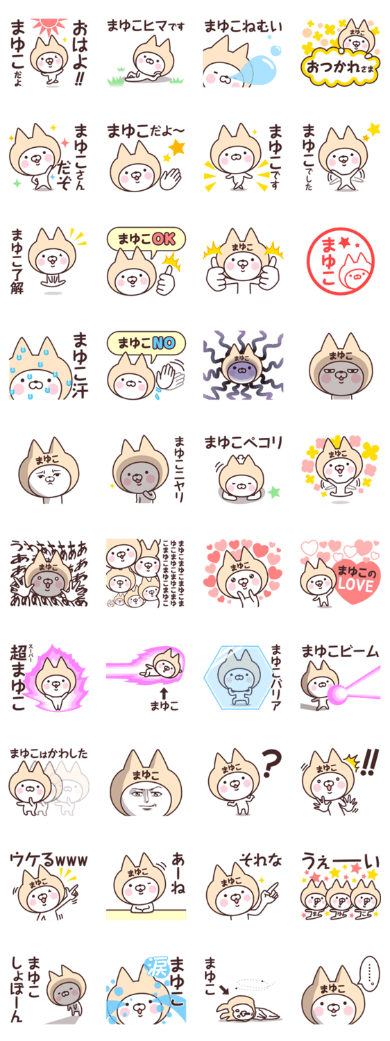まゆこさん、まゆこちゃんが使える名前スタンプです。マユコ/真由子/麻由子/繭子/麻祐子/万由子/麻友子/真友子/真悠子/巻由子/眉子/まゆ子/麻佑子/茉祐子さんはぜひ。