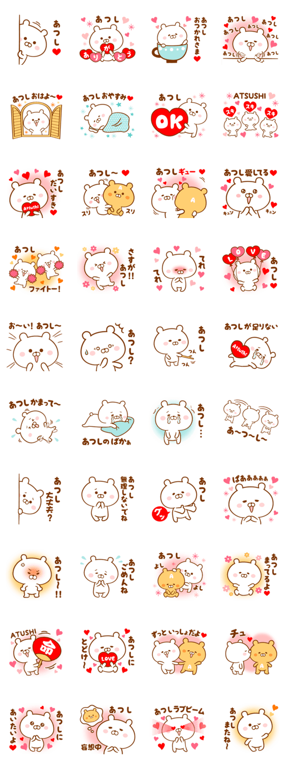 あつし/淳/敦/篤/厚/敦司/敦史/篤史/ 篤志/厚志/アツシ 等、あつしくんに送る名前・あだ名スタンプです。かわいいクマで大好きな恋人、家族、友達に気持ちを伝えてね♥